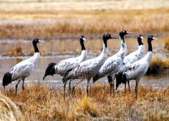 林周縣卡孜水庫(kù)附近覓食的黑頸鶴。
