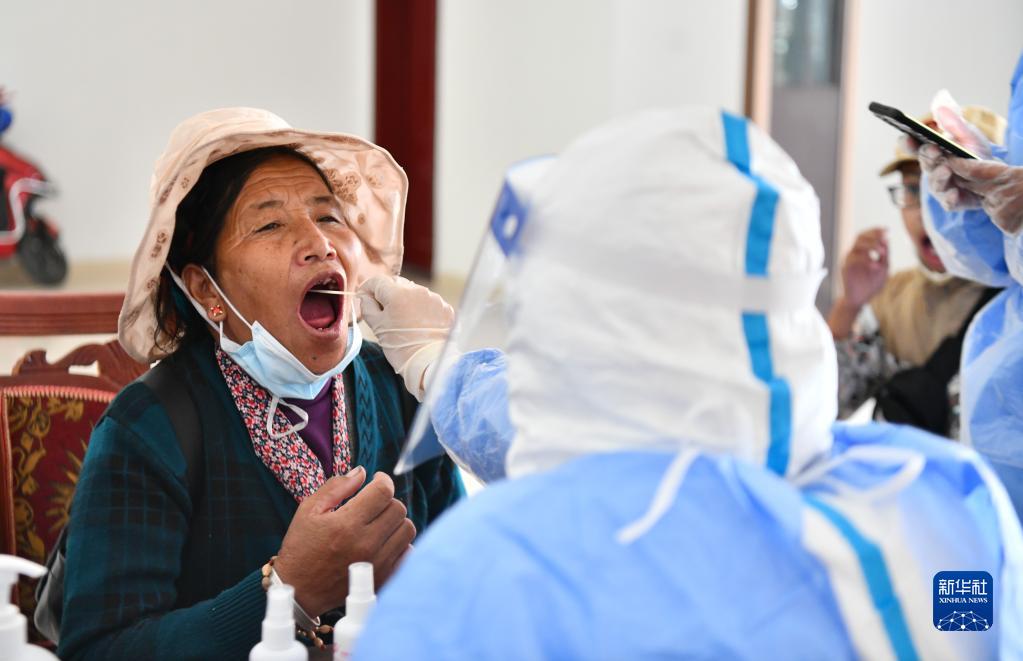 8月10日上午,居民在拉薩市某小區(qū)核酸采樣點(diǎn)接受核酸采樣。新華社記者 晉美多吉 攝