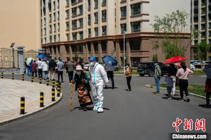 圖為8月12日,拉薩一小區(qū)內(nèi),工作人員攙扶藏族老人進(jìn)行核酸檢測(cè)?!〗w波 攝
