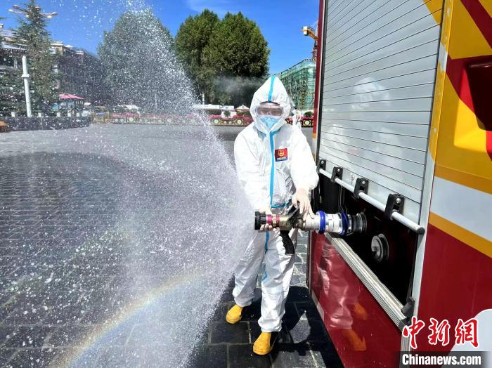 圖為拉薩消防指戰(zhàn)員在主城區(qū)街道進(jìn)行消殺。 拉薩市消防救援支隊 攝