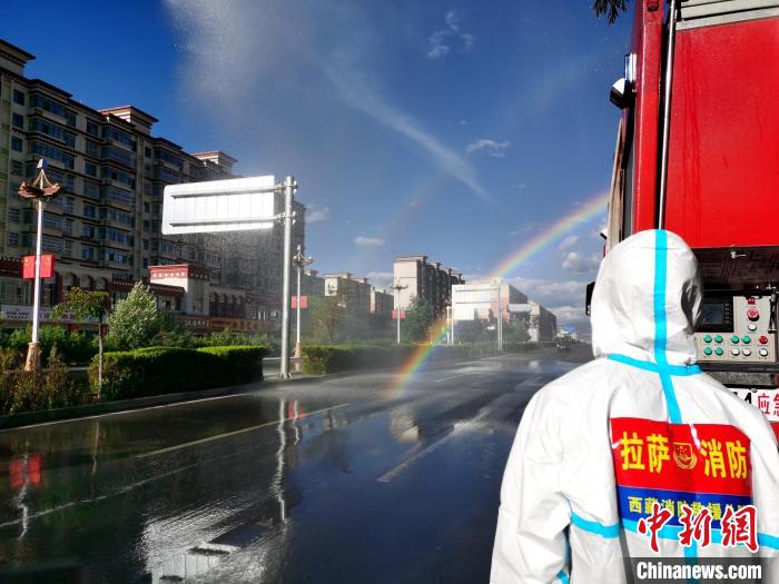 圖為拉薩消防指戰(zhàn)員在主城區(qū)街道進(jìn)行消殺?!±_市消防救援支隊 攝