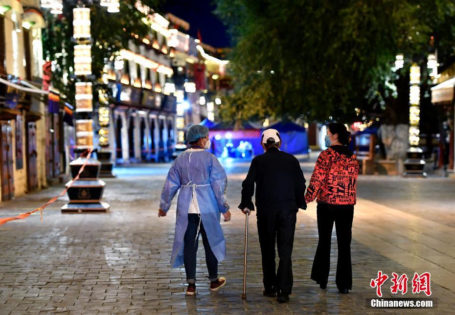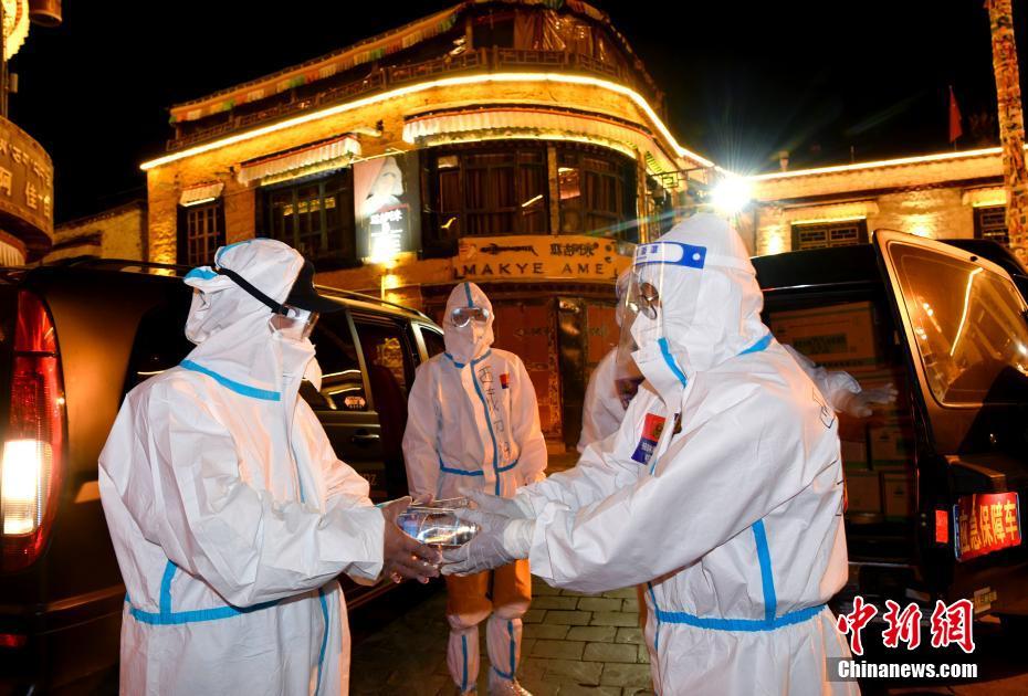8月14日,西藏拉薩,志愿者在八廓街內(nèi)為防疫人員送去抗疫物資。當(dāng)日,拉薩市應(yīng)對新冠肺炎疫情工作領(lǐng)導(dǎo)小組決定,至8月15日凌晨3時(shí)的拉薩主城區(qū)消殺管理時(shí)間,再延長三天至8月18日凌晨3時(shí),在拉薩主城區(qū)以社區(qū)網(wǎng)格為基本單位,快速精準(zhǔn)開展多輪全員核酸篩查。 中新社記者 李林 攝
