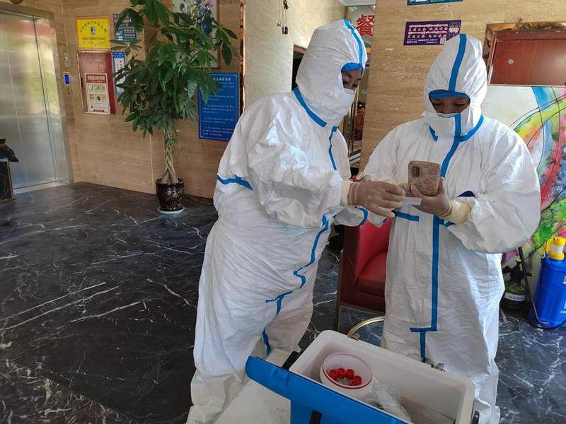 很快她們的申請(qǐng)有了回應(yīng),兩位老黨員變身“大白”,走上了核酸檢測(cè)崗位。從上午9點(diǎn)開(kāi)始,上門(mén)為隔離人員進(jìn)行核酸采樣。一直到夜里11點(diǎn)才回家,卸下“大白”防護(hù)服時(shí)渾身已濕透?!澳軈⑴c到疫情防控志愿服務(wù)中,做點(diǎn)力所能及的事兒,是我的義務(wù)。”旺前卓瑪說(shuō)。
