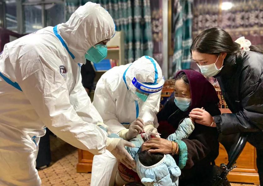 圖為西藏山南邊境管理支隊普瑪江塘邊境派出所移民管理警察協(xié)助醫(yī)務人員為轄區(qū)群眾進行核酸檢測。涂奇源 攝