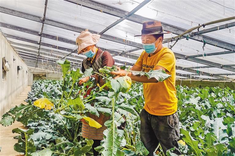 在山南市隆子縣菜籃子基地的大棚內(nèi),記者看到,農(nóng)民們正忙碌地采摘成熟的花椰菜、青椒、西藍花等蔬菜。