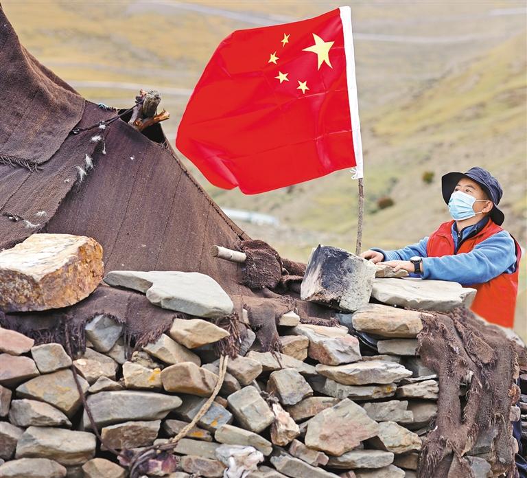 圖為山南市瓊結縣加麻鄉(xiāng)特日村駐村工作隊幫助牧民更換國旗。 通訊員 倫珠澤仁 記者 次旺 攝