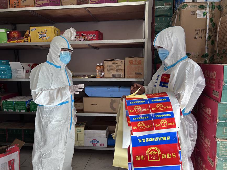 圖為日喀則支隊(duì)后勤管理員李萬樂(右一)與醫(yī)療、生活物資保供單位聯(lián)系,調(diào)集防疫物資。