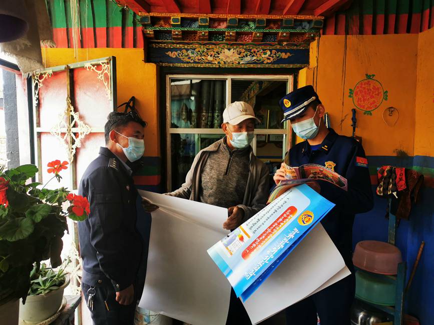 圖為日喀則市消防救援支隊(duì)聯(lián)合轄區(qū)民警進(jìn)村入戶宣傳。