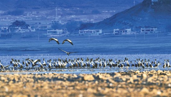 西藏自治區(qū)林周縣虎頭山水庫(kù)一帶的黑頸鶴群。
