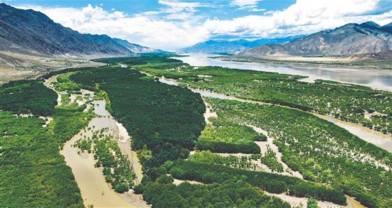 持續(xù)開(kāi)展國(guó)土綠化行動(dòng),大美西藏生態(tài)持續(xù)良好。截至2021年底,全區(qū)森林覆蓋率達(dá)12.31%,草原綜合植被覆蓋度達(dá)47.53%,全區(qū)環(huán)境空氣質(zhì)量?jī)?yōu)良率達(dá)99.8%,地表水質(zhì)達(dá)標(biāo)率100%。圖為雅魯藏布江山南段沿線通過(guò)植樹(shù)造林形成的長(zhǎng)160公里、平均寬約1.8公里的綠色長(zhǎng)廊。