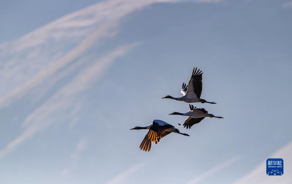 黑頸鶴在林周縣黑頸鶴自然保護(hù)區(qū)上空盤(pán)旋(11月6日攝)。新華社記者 張汝鋒 攝