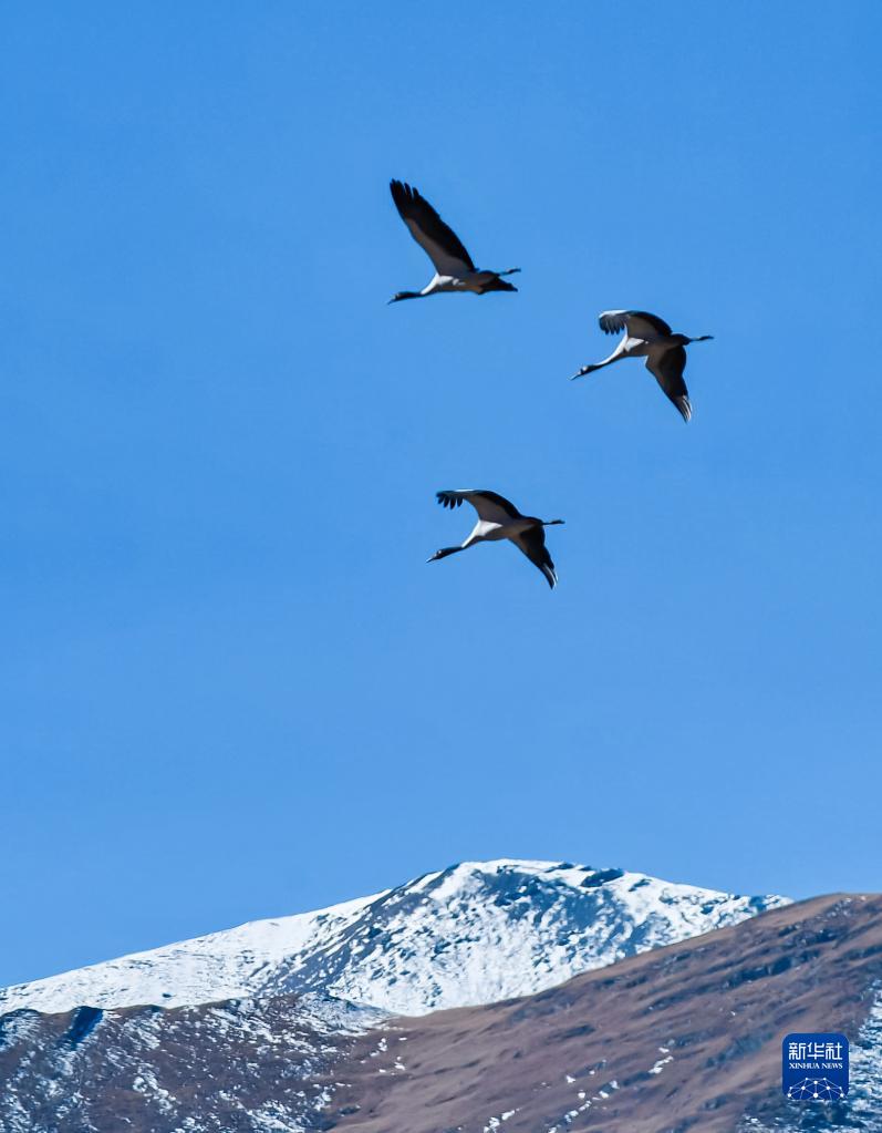 黑頸鶴群飛過(guò)林周縣強(qiáng)嘎鄉(xiāng)境內(nèi)山梁(11月6日攝)。新華社記者 姜帆 攝