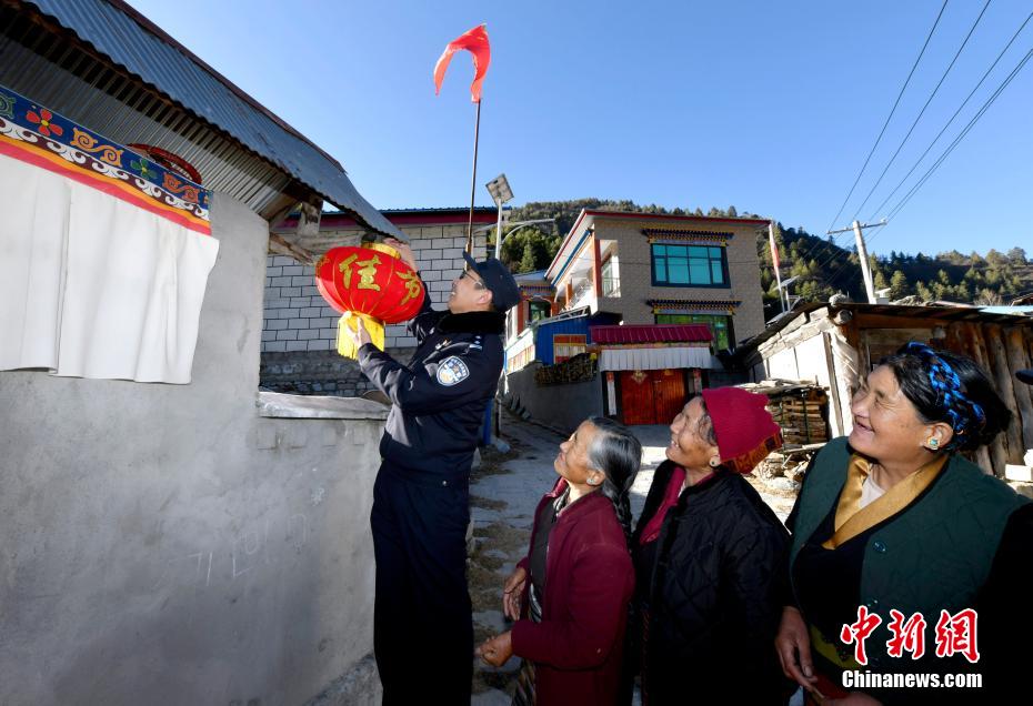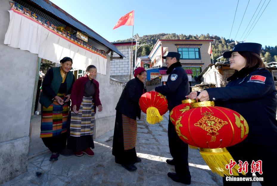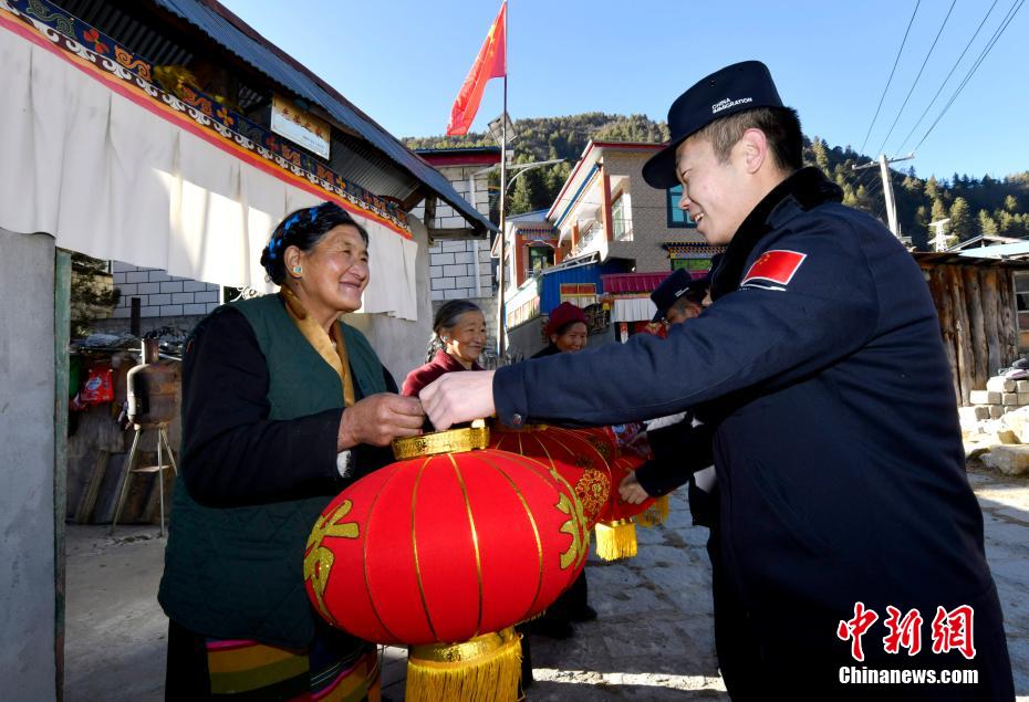 1月5日,移民警察為藏族老阿媽送上燈籠。李林 攝