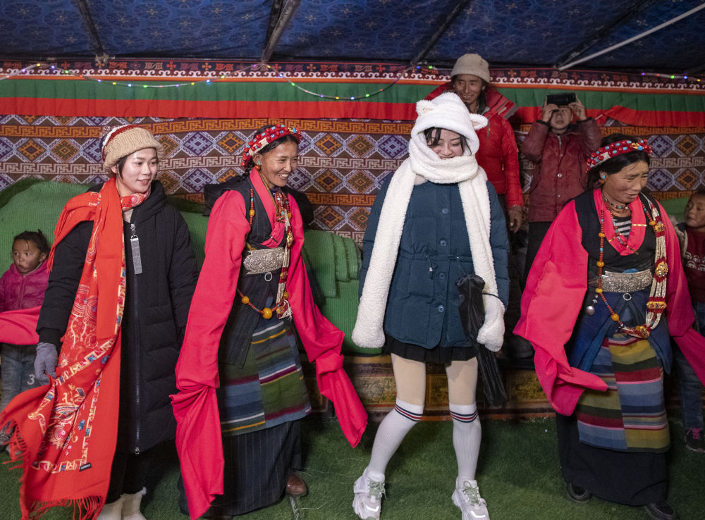 巴松村的群眾和游客一起跳鍋莊舞迎新春(2020年1月20日攝)。