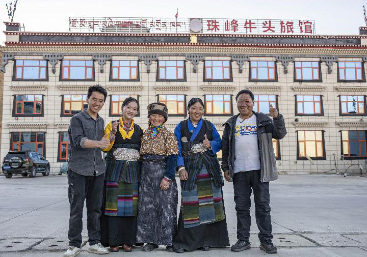 多吉一家在新開業(yè)的牛頭旅館前合影留念(2022年5月10日攝)。