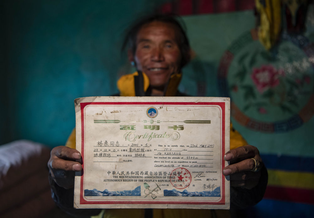 和下了山后日子過得風(fēng)生水起的多吉不同,格桑傳奇的經(jīng)歷,并沒有給生活帶來什么本質(zhì)的改變。格桑并沒有出名,在他看來,登頂?shù)慕?jīng)歷除了能證明自己身體好,也說不出其他意義。登頂照片搬家的時候就找不到了,除了一張登頂證書,還留下的紀(jì)念品,就是“冬天放牧?xí)r穿著暖和的連體羽絨服”。