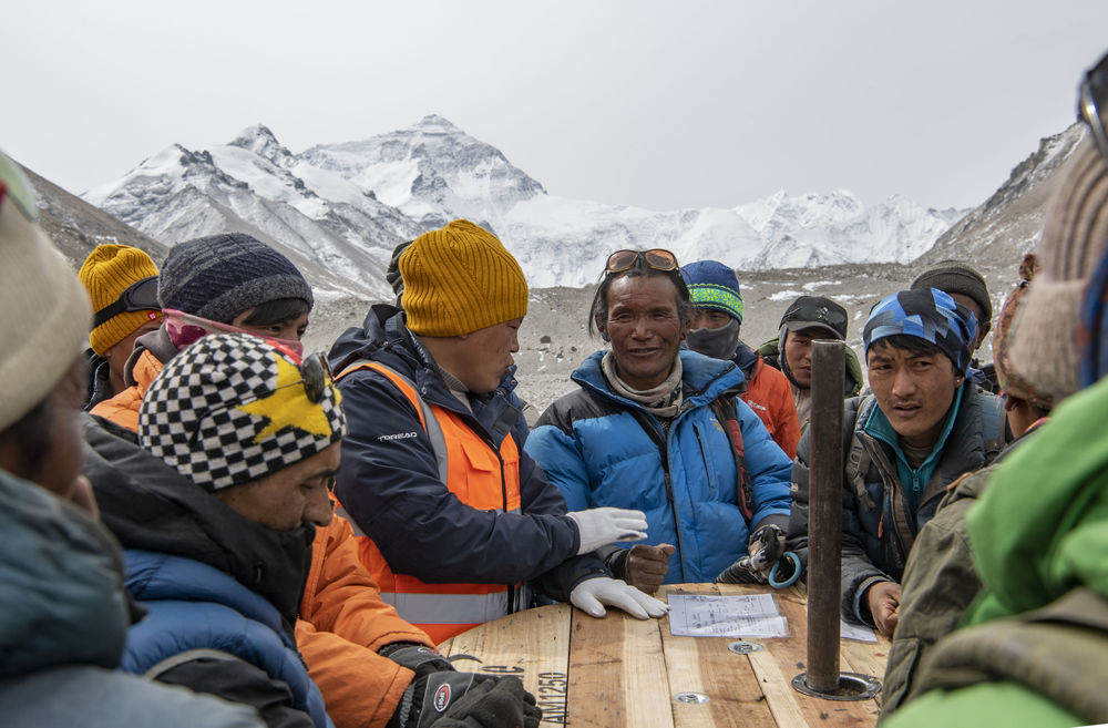 格桑(中間穿藍色羽絨服者)和其他村民一起商議將光纖運送到海拔6500米前進營地的方法(2020年4月15日攝)。2020珠峰高程測量期間,為保障峰頂信號質(zhì)量,網(wǎng)絡(luò)運營商需要將光纖鋪設(shè)至海拔6500米的珠峰前進營地。格桑和其他村民一起,承擔(dān)起運輸光纖的任務(wù)。