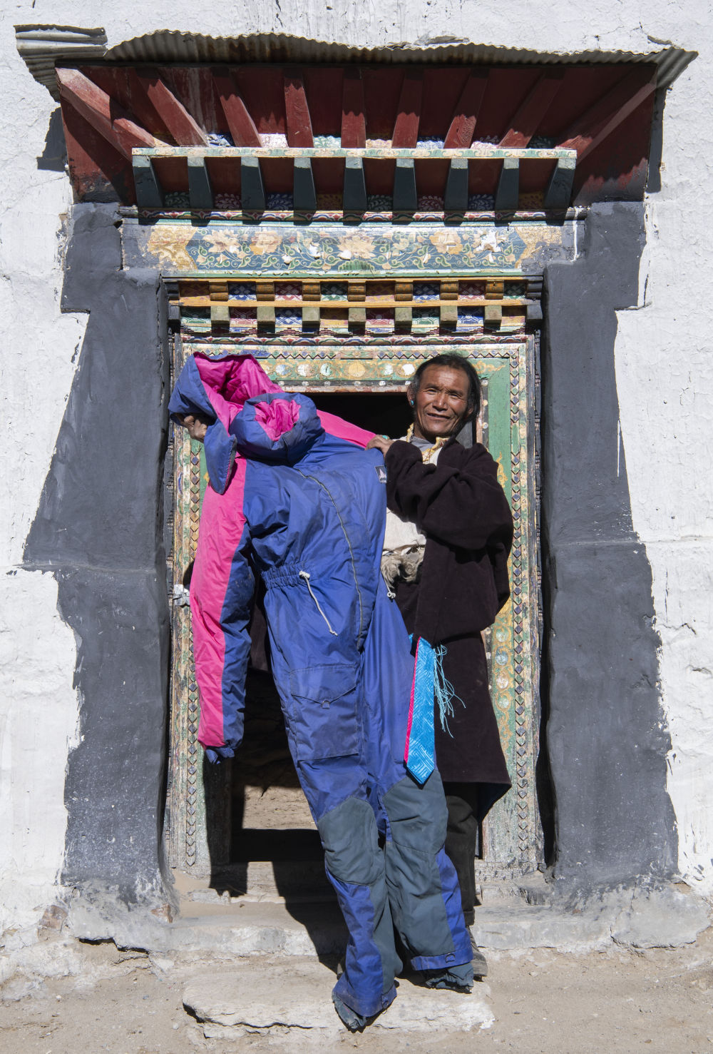 格桑在展示自己登頂時穿過的連體羽絨服(2020年1月22日攝)。