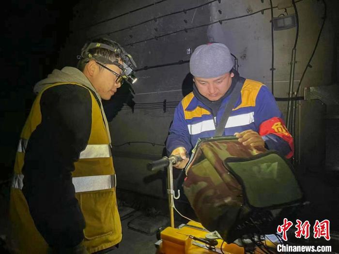 次旦平措(右)與同事深夜在拉林鐵路進行鋼軌探傷作業(yè)?!●R生明 攝