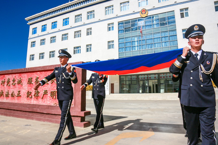 圖為拉薩鐵路公安民警高擎警旗走過“四句話、十六字”訓(xùn)詞前。單義倫攝