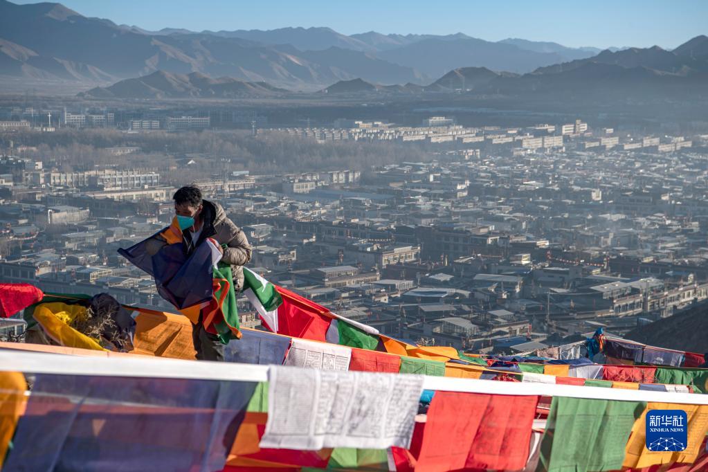 1月24日,日喀則市桑珠孜區(qū)的藏族群眾在懸掛五彩經(jīng)幡。新華社記者 孫非 攝