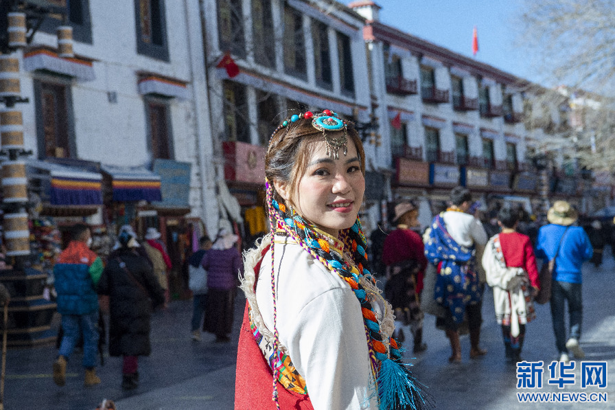 一名游客在八廓街拍照留念(1月30日攝)。新華網 旦增努布 攝