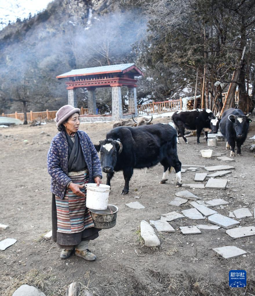卓嘎準(zhǔn)備喂牛(2023年1月8日攝)。新華社記者 晉美多吉 攝