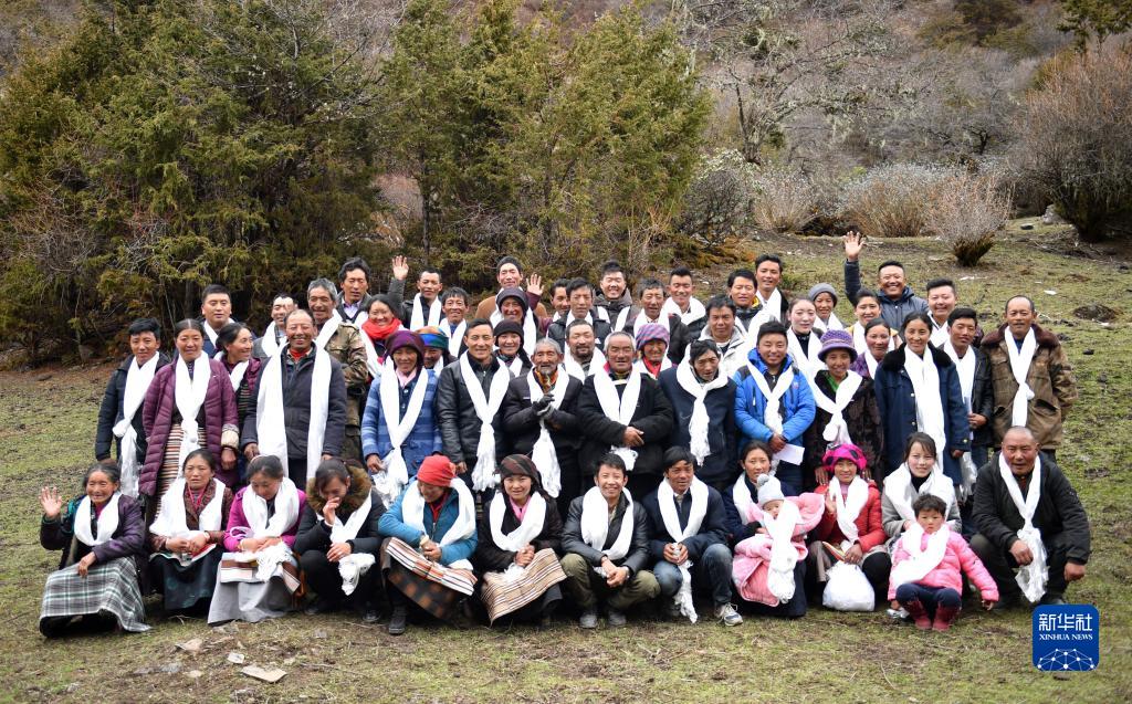 新遷入玉麥鄉(xiāng)的居民代表與卓嘎、央宗等合影(2019年4月9日攝)。新華社記者 晉美多吉 攝