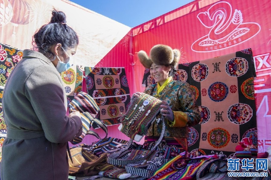 2月6日,達(dá)孜區(qū)旦卓婦女卡墊專業(yè)合作社工作人員在交易會(huì)上推銷傳統(tǒng)手工制品。新華網(wǎng)旦增努布攝
