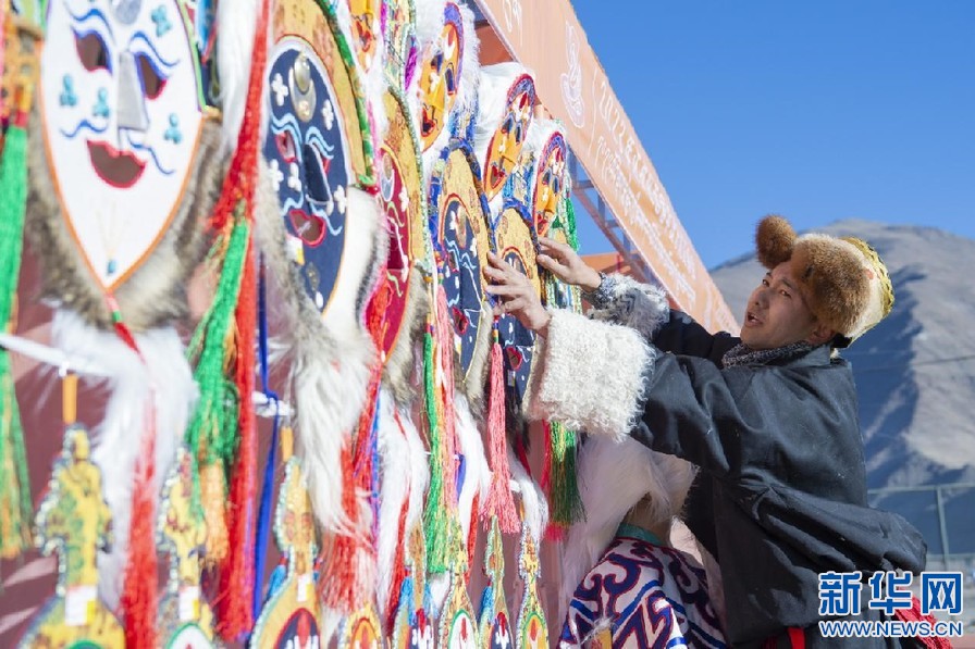 2月6日,達(dá)孜區(qū)阿古傳統(tǒng)藏戲服飾農(nóng)牧民專業(yè)合作社工作人員在交易會(huì)上推銷藏戲面具。新華網(wǎng) 旦增努布 攝