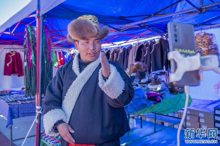 2月6日,商戶在交易會(huì)上通過直播介紹年貨。新華網(wǎng) 旦增努布 攝