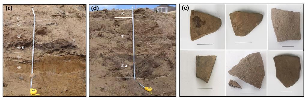圖(c)(d)分別為共塘遺址調(diào)查剖面1和剖面2地層(三角形表示陶片位置)。圖(e)為本研究所分析的陶片照片。(資料圖片由第二次青藏科考隊“人類活動歷史及其影響”分隊提供)