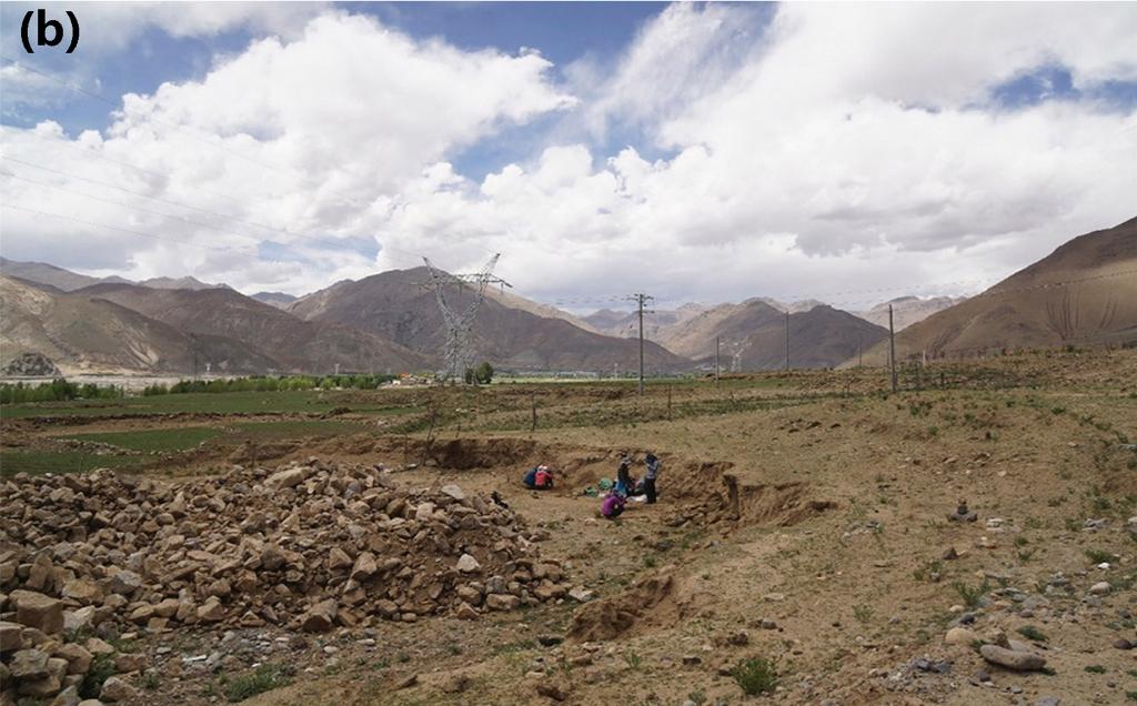 圖(b)為科考隊員發(fā)現(xiàn)共塘遺址后隨即進(jìn)行地層剖面清理和樣品采集。(資料圖片由第二次青藏科考隊“人類活動歷史及其影響”分隊提供)