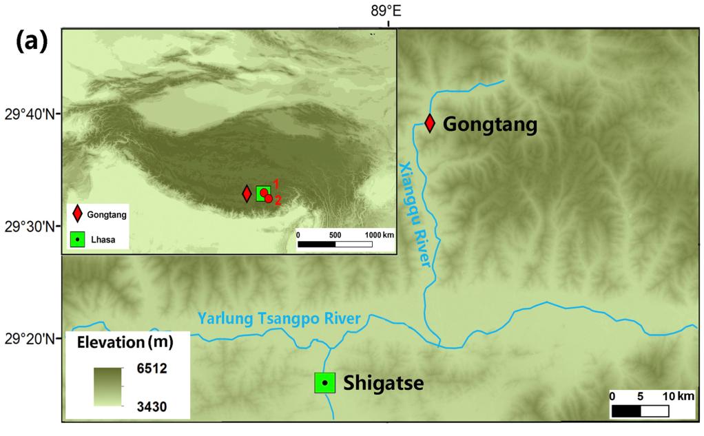 圖(a)為雅魯藏布江中游部分地區(qū)遺址背景資料圖,曲貢(1)、邦嘎(2)和共塘遺址位置(紅色菱形所示)。(資料圖片由第二次青藏科考隊“人類活動歷史及其影響”分隊提供)