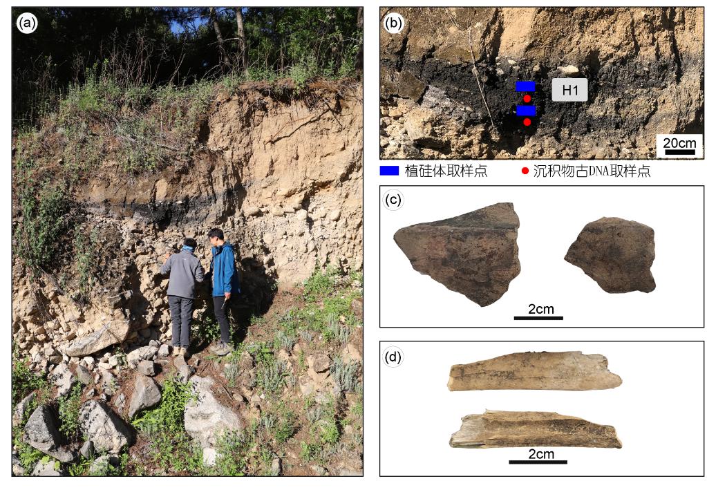 圖(a)孔桑橋遺址調查剖面圖;圖(b)采樣位置;圖(c)調查剖面出土陶片;圖(d)調查剖面出土動物骨骼。(資料圖片由聯(lián)合科考隊提供)