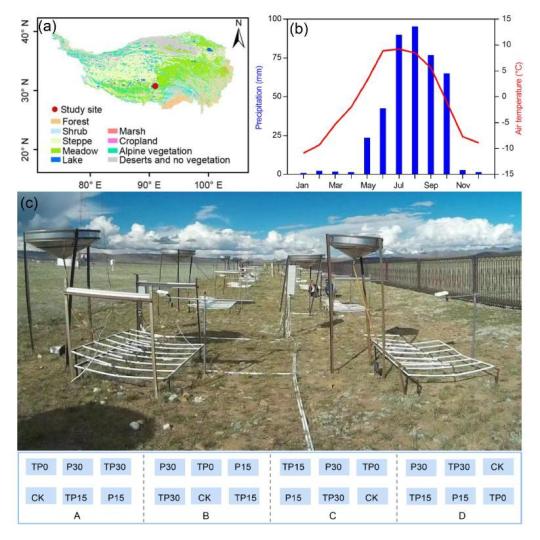 研究站點植被類型(a)、氣象條件(b)和實驗設(shè)計(c)。中科院青藏高原所 供圖