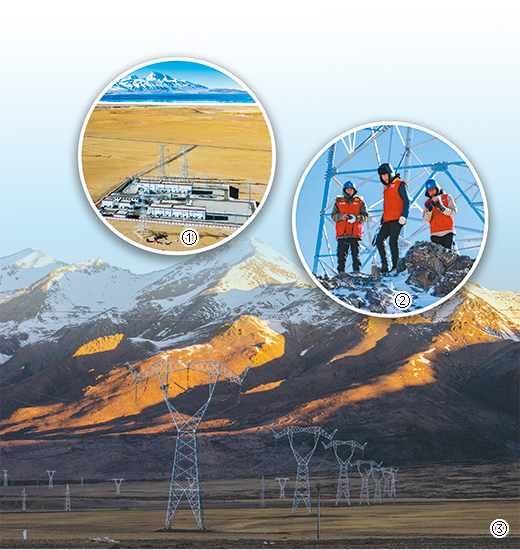 圖①:位于海拔4700多米的阿里聯(lián)網(wǎng)工程霍爾變電站。圖②:國網(wǎng)阿里公司工作人員正在巡檢線路。圖③:阿里地區(qū)的曠野上,電力鐵塔在夕陽下熠熠生輝。(本文照片均為記者徐馭堯攝)