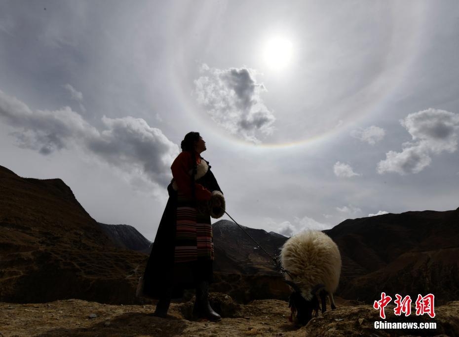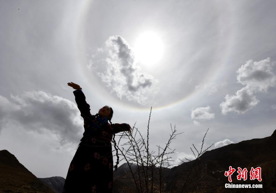 3月20日,西藏拉薩,身著藏裝的游客與日暈相映。李林 攝