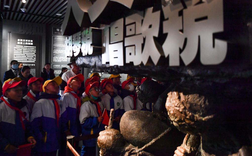 與此同時(shí),西藏百萬(wàn)農(nóng)奴解放紀(jì)念館也迎來(lái)了不少市民、中小學(xué)生和游客。這座占地2700平方米的展館里,陳列著反映舊西藏苛捐雜稅的雕像,再現(xiàn)舊西藏農(nóng)奴被囚禁虐待的情景。