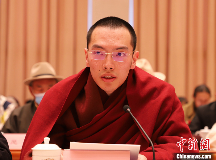 圖為宗教界代表達(dá)隆夏仲·阿旺洛桑·旦增曲吉尼瑪在座談會(huì)上發(fā)言。 中新社記者 趙延 攝