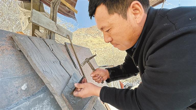 今年35歲的桑周才仁出生在石刻世家,父輩都是石匠,算起來他也是家族石刻技藝的第六代傳承人了。自幼,桑周才仁就對石頭有一種特殊的情感,14歲就開始接受父親的指導(dǎo),悉心學(xué)習(xí)刻字、線雕、浮雕、繪畫等與石刻相關(guān)的技藝。“刻字是石刻技藝中的基礎(chǔ),需要反復(fù)練習(xí),刻不好就得磨掉重做,直到刻出滿意的作品為止。”桑周才仁對記者說,當(dāng)時聽到父親一句“刻得很好”的評價,他就能高興一整天。