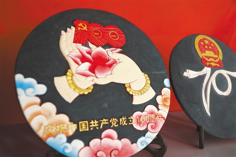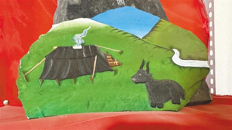 “我們首先要選好一塊石頭,根據(jù)它的形狀和質(zhì)地來決定刻成一幅什么樣的作品,然后再畫出作品的輪廓進(jìn)行雕刻,最后一步則為上色?!鄙V懿湃薀崆榈貛覀儏⒂^他的工作室,“慶祝中國共產(chǎn)黨成立100周年”“牧家生活”“扎西德勒”“白海螺”“和氣四瑞像”……每一幅作品活靈活現(xiàn)在大大小小石板上,栩栩如生、惟妙惟肖,堅硬的石頭在他出神入化的雕工下竟變得柔軟,又不失力量和美感。