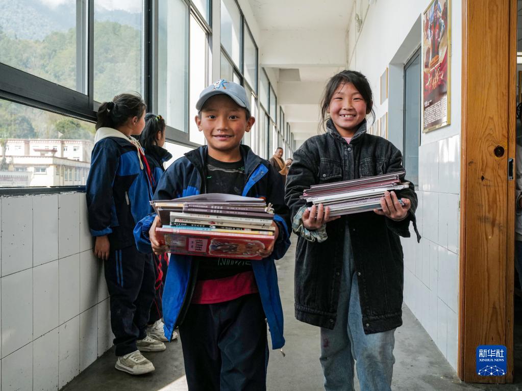 3月31日,學(xué)生們正在向教室的圖書角搬運新圖書。新華社記者 洛卓嘉措 攝