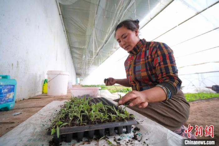 西藏阿里地區(qū)改則縣生態(tài)農(nóng)牧業(yè)產(chǎn)業(yè)園溫室大棚內(nèi)的工作人員正在進行育苗工作。何蓬磊 攝