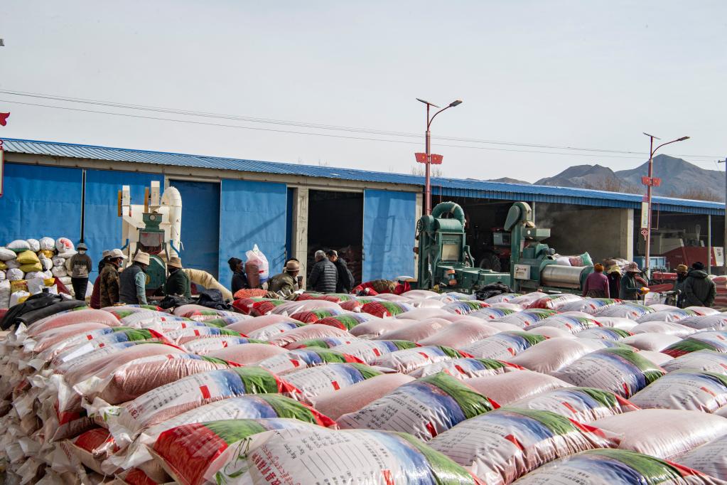 這是江孜縣紫金鄉(xiāng)努堆村的農(nóng)機(jī)農(nóng)民專業(yè)合作社內(nèi),已完成裝袋的青稞良種(3月20日攝)。新華社記者孫非 攝