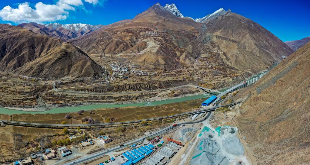 鳥(niǎo)瞰拉薩至日喀則高速公路五曲雅江大橋建設(shè)現(xiàn)場(chǎng)(無(wú)人機(jī)照片,3月12日攝)。新華社記者姜帆 攝