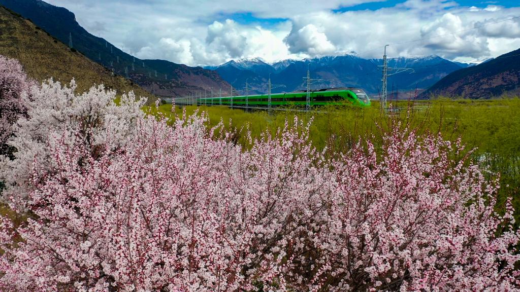 復(fù)興號(hào)列車行駛在兩側(cè)桃花盛開(kāi)的拉林鐵路上(無(wú)人機(jī)照片,3月25日攝)。新華社記者姜帆 攝