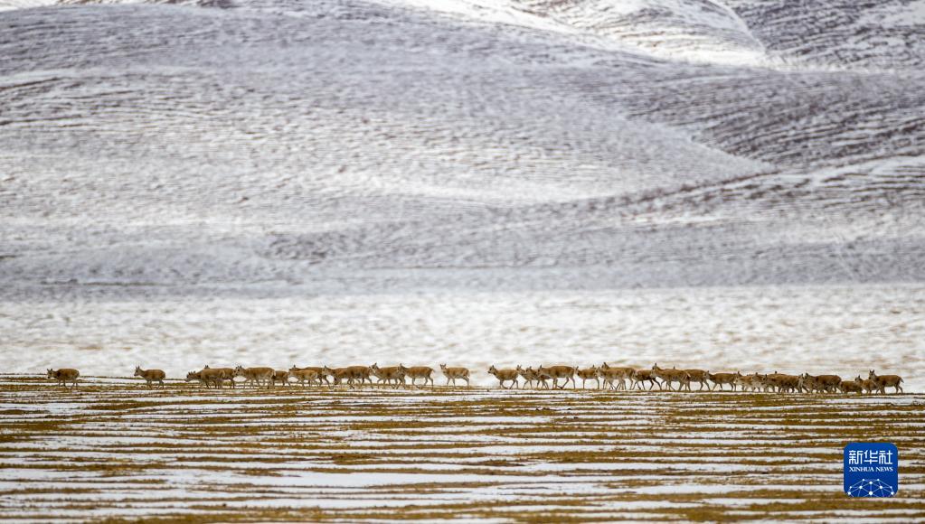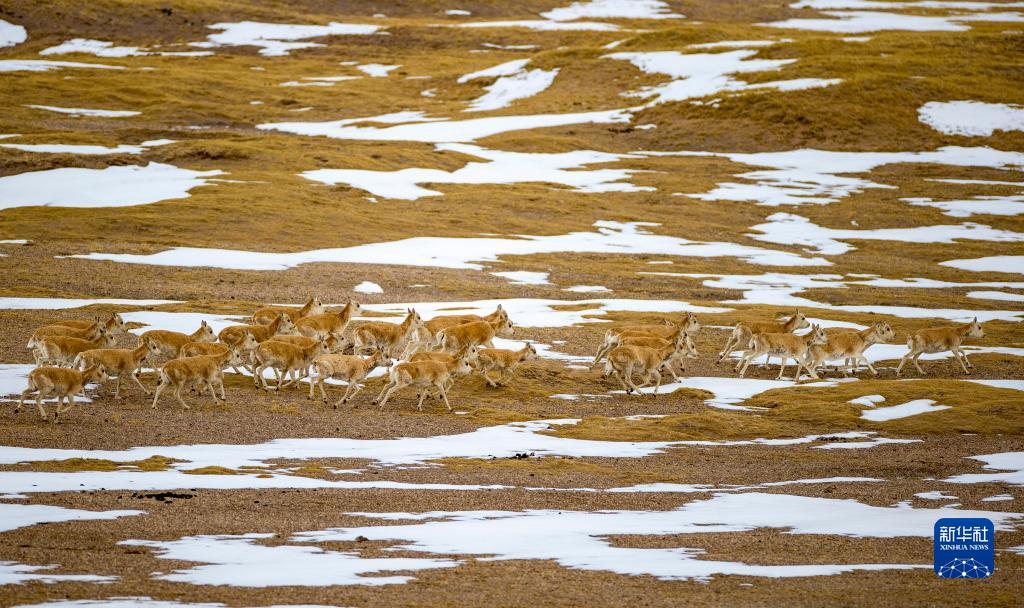 這是在羌塘國家級自然保護區(qū)那曲市雙湖縣區(qū)域內(nèi)拍攝到的藏羚羊群(4月17日攝) 。新華社記者 姜帆 攝