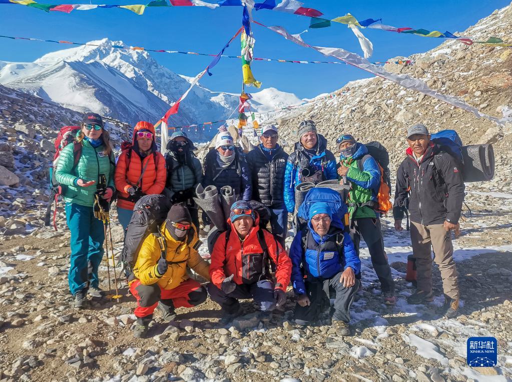 董紅娟(后排左三)在開始攀登希夏邦馬峰前與隊(duì)友合影留念(4月23日攝)。新華社發(fā)(頓巴 攝)
