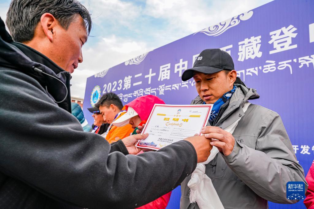 5月3日,工作人員向登山愛好者頒發(fā)登頂證書。新華社記者 孫非 攝